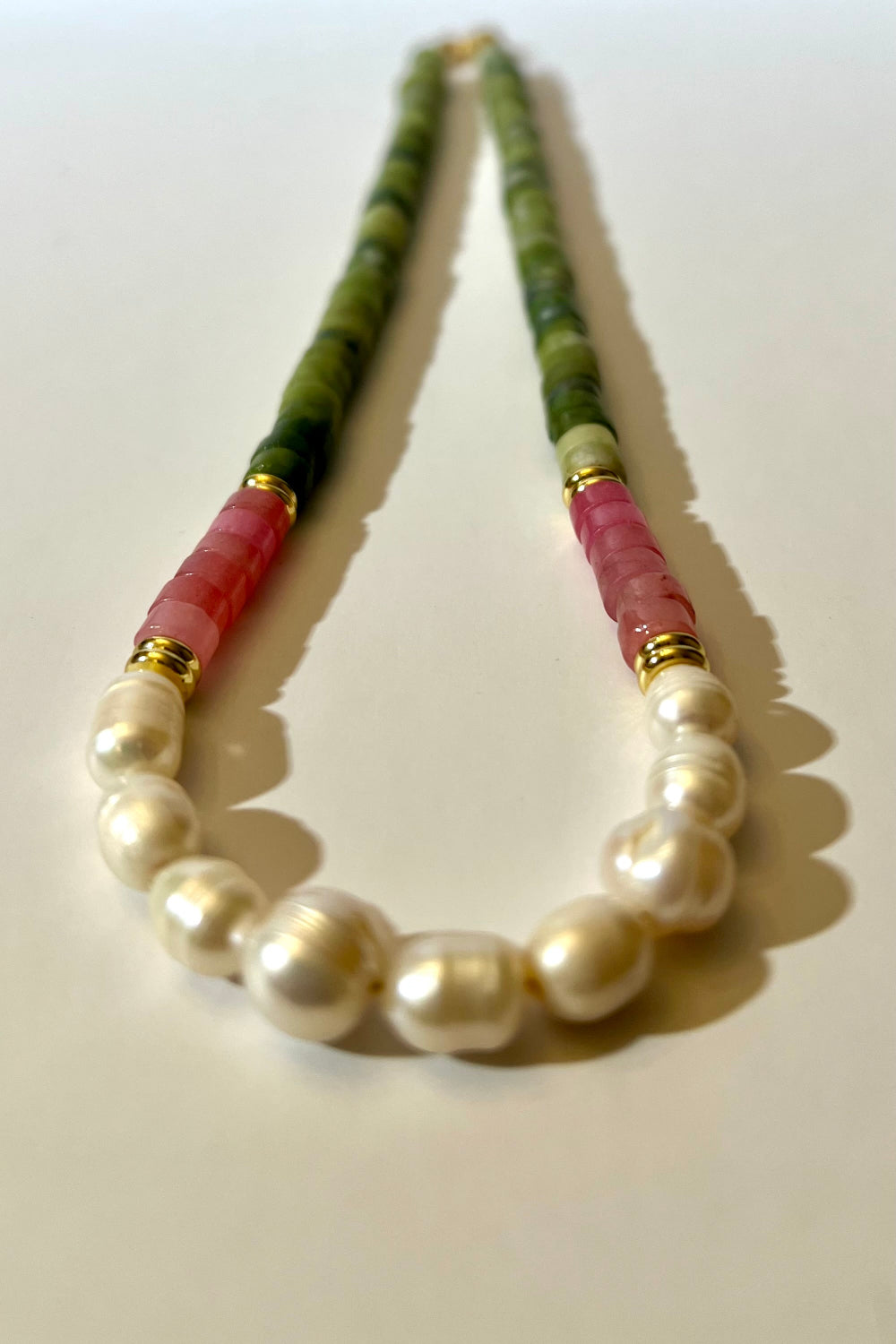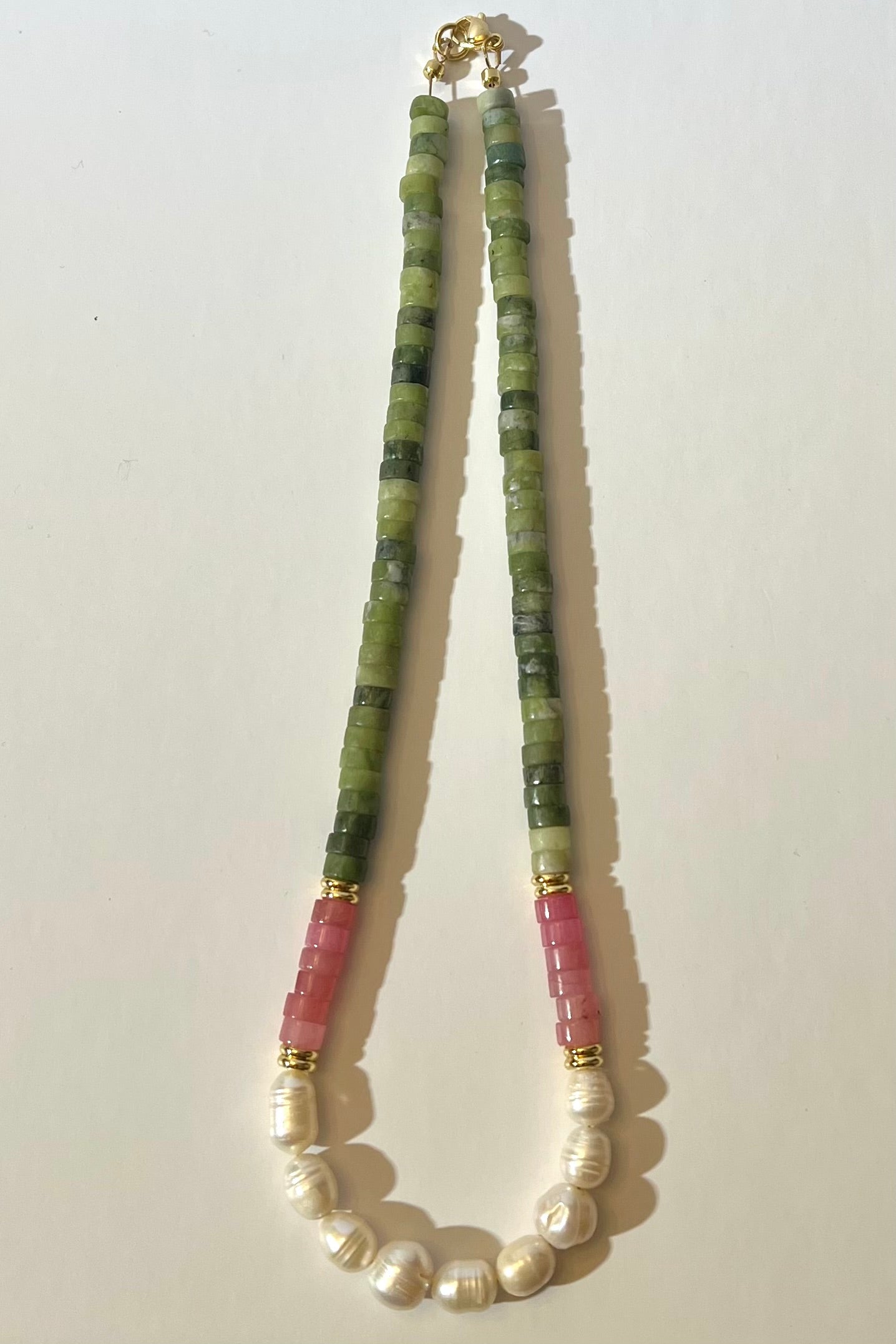 Green Jade, Strawberry Quartz, and Freshwater Pearl Necklace