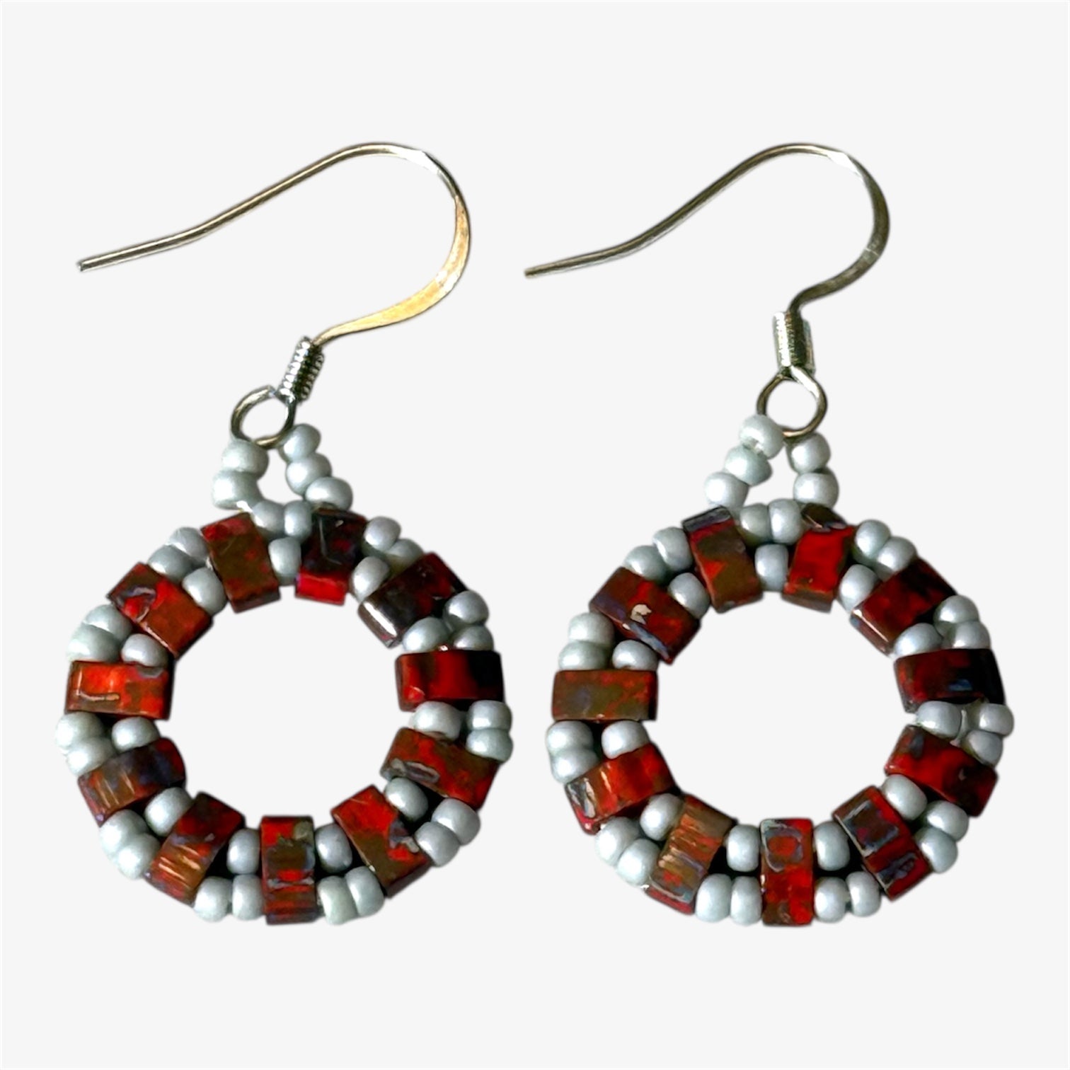 Beaded Circle Earrings in Marbled Red and Gray